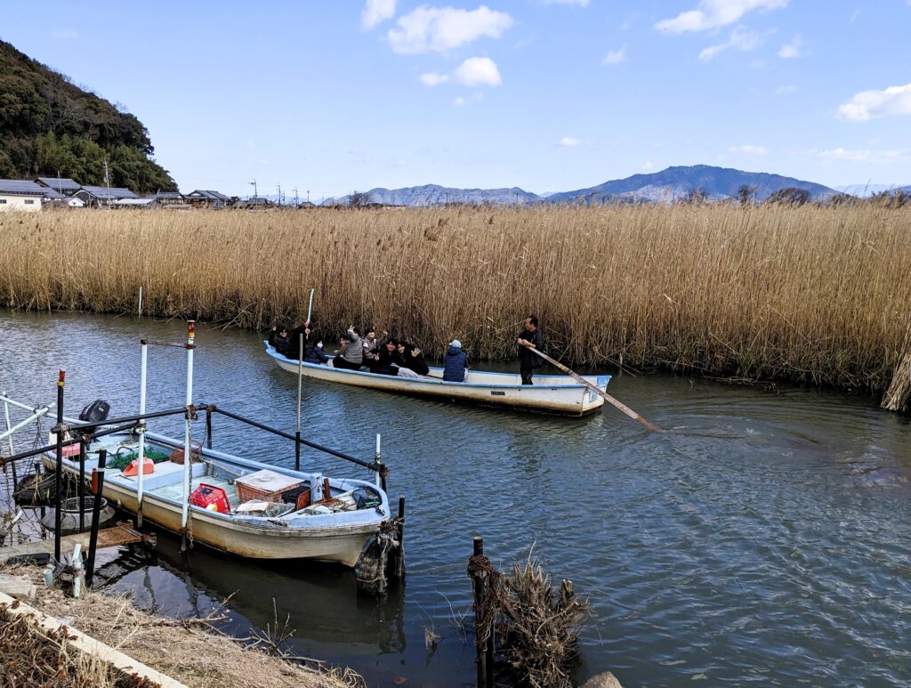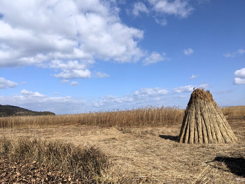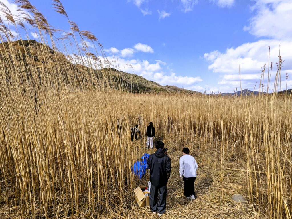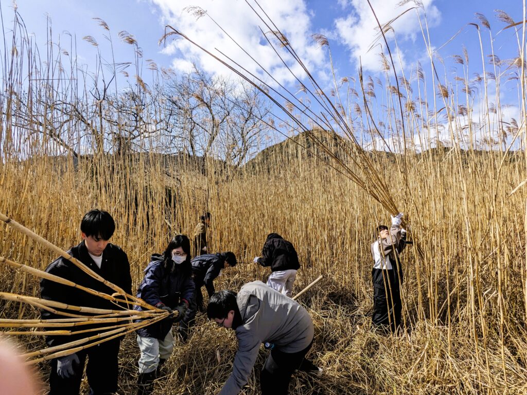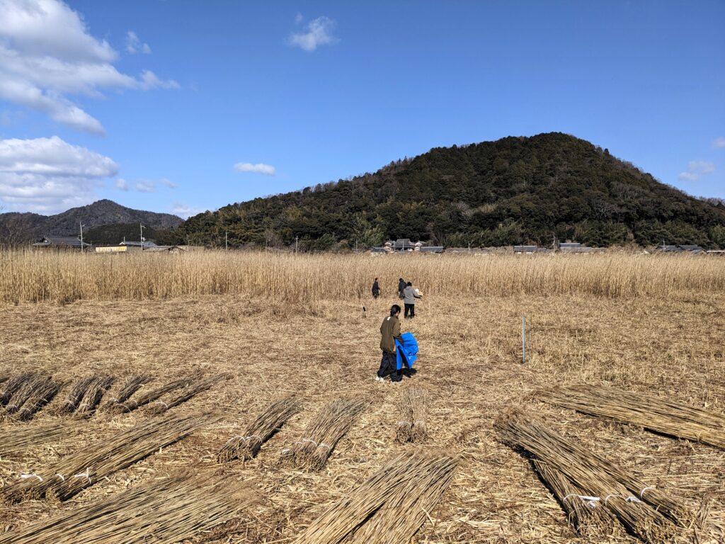 We conducted a reed harvest for survey purposes in the reed beds around Lake Nishinoko—the largest inland lagoon adjacent to Lake Biwa—located in Maruyama-cho, Omihachiman City. At multiple points in Maruyama-cho, we measured reed density per unit area, mean stand height, and biomass to examine differences by location and management conditions. The weather was fine and pleasantly warm, and we enjoyed a productive day working up a sweat during the reed harvest.