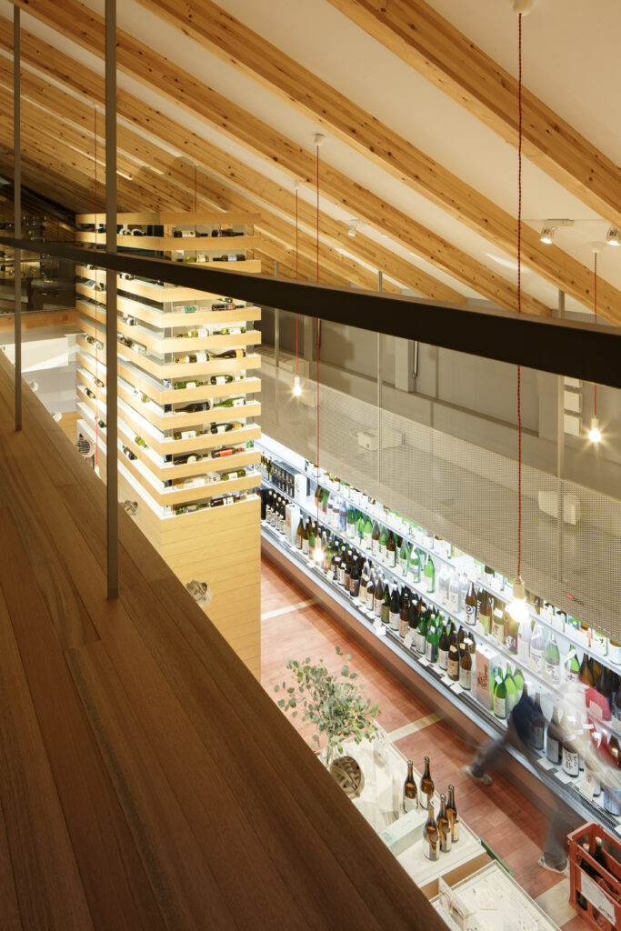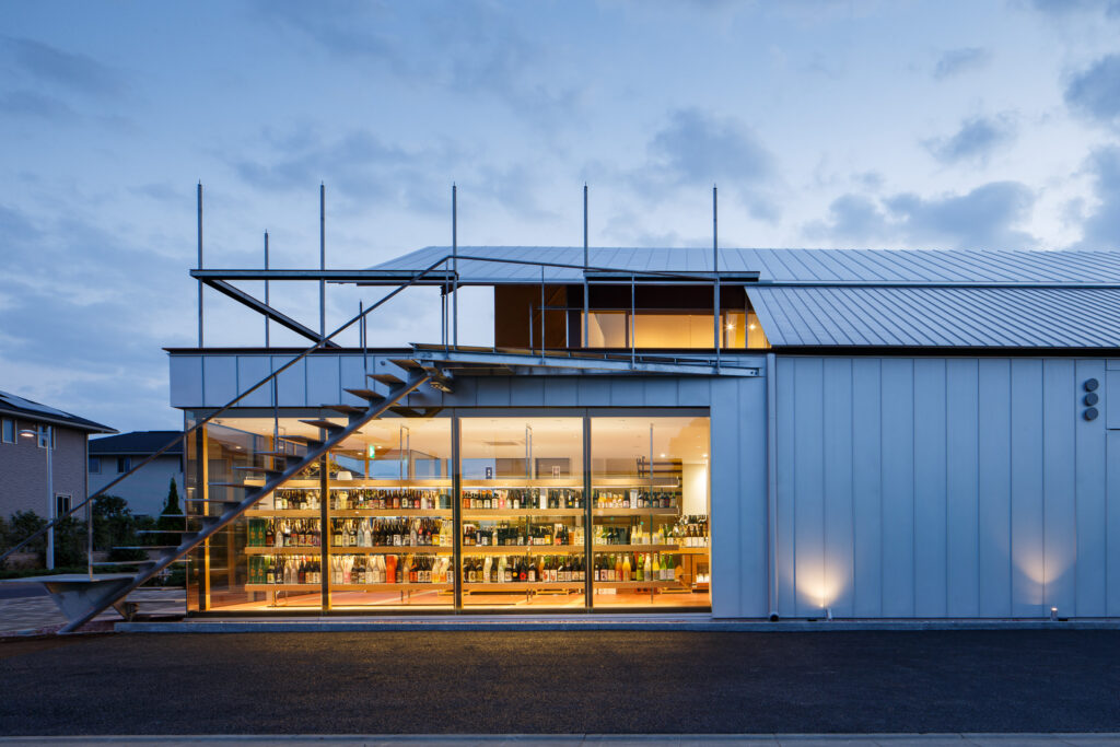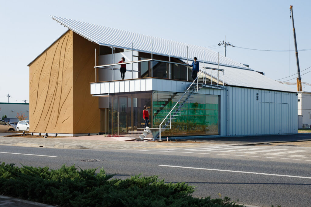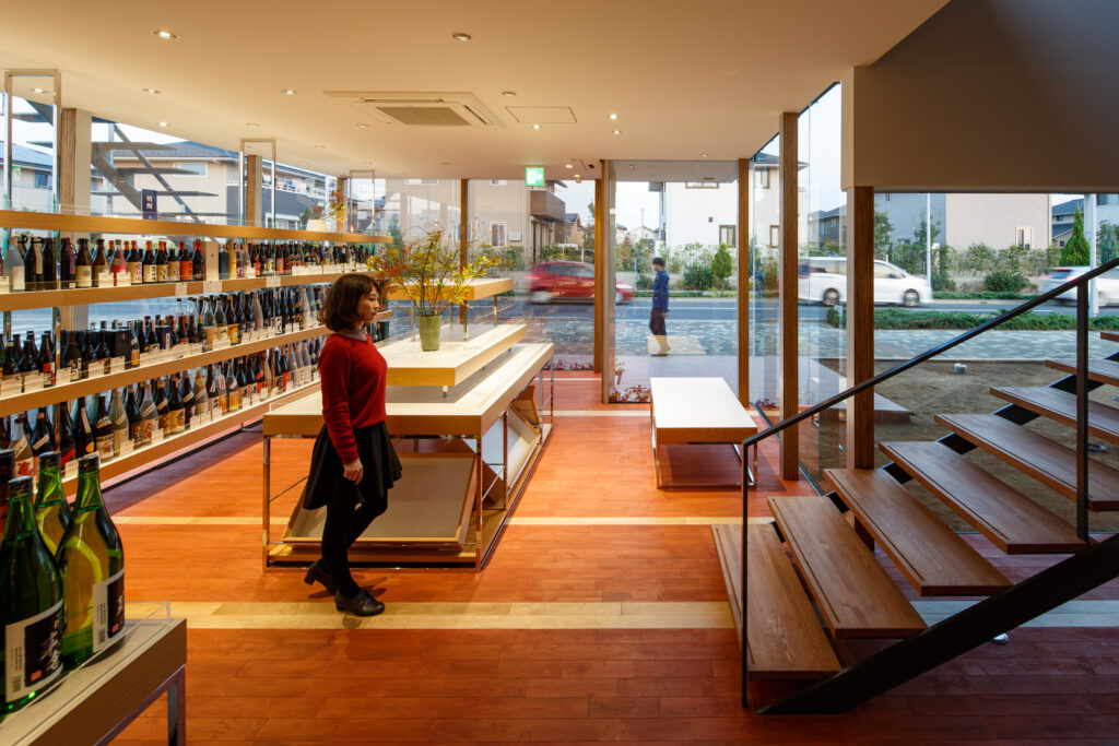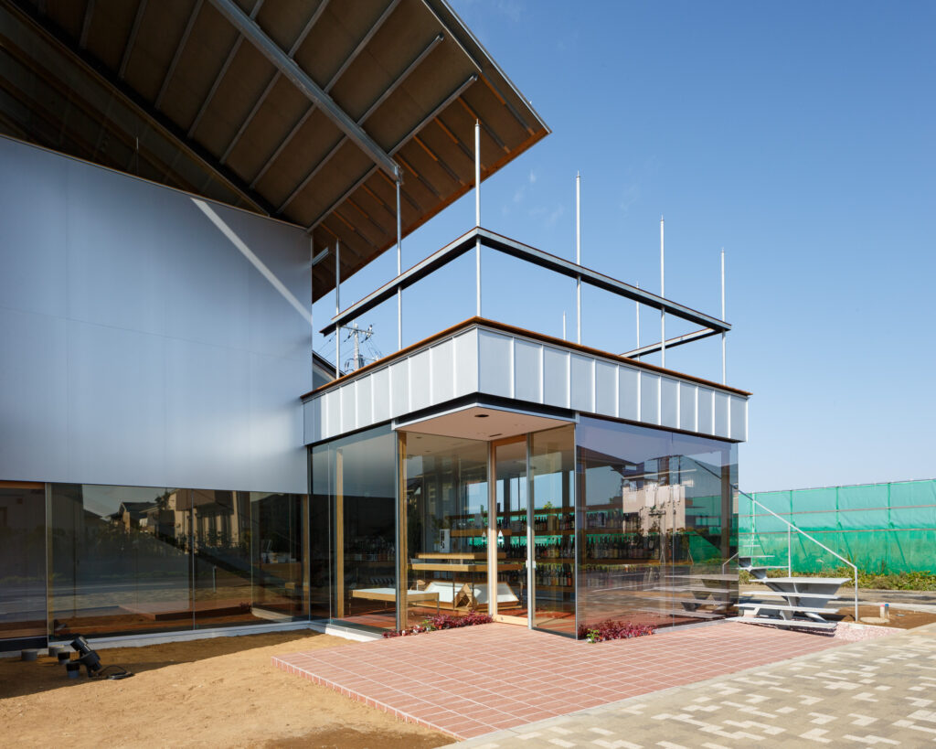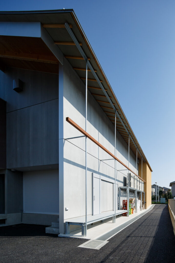 Although the building employs conventional timber framing based on a 105 mm (3.5-sun) module, the materials are varied to suit each program area: exterior and shop columns are either 42 mm-diameter steel pipes or square 105 × 105 mm LVL members.