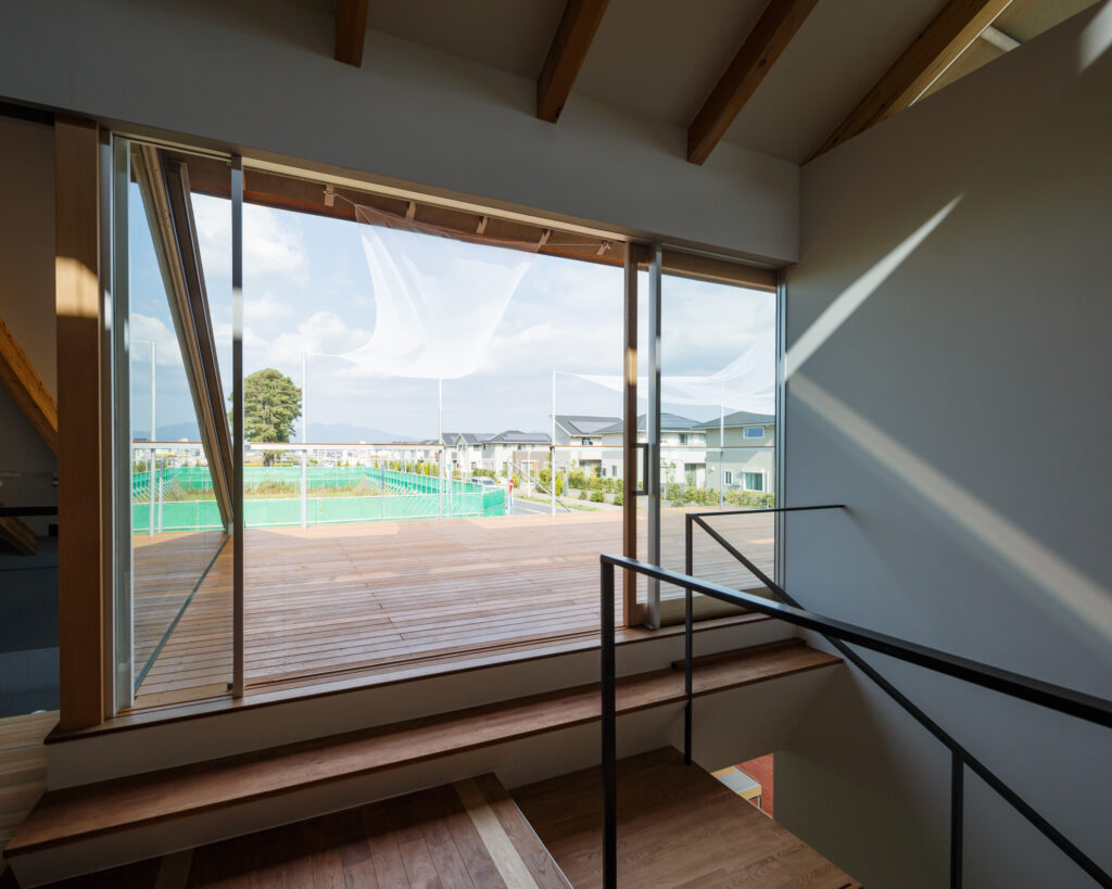 In the roof, high-density wood-wool cement board is used as the roof sheathing. Where the eaves overhang is small, the sheathing is cantilevered and rafters are omitted; where the overhang is moderate, 45 mm-square rafters are provided; and where the overhang is large, steel plates are added for reinforcement. In this way, the structure and spatial character are rationally tuned to each location while remaining deliberately varied.
