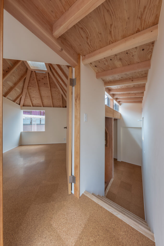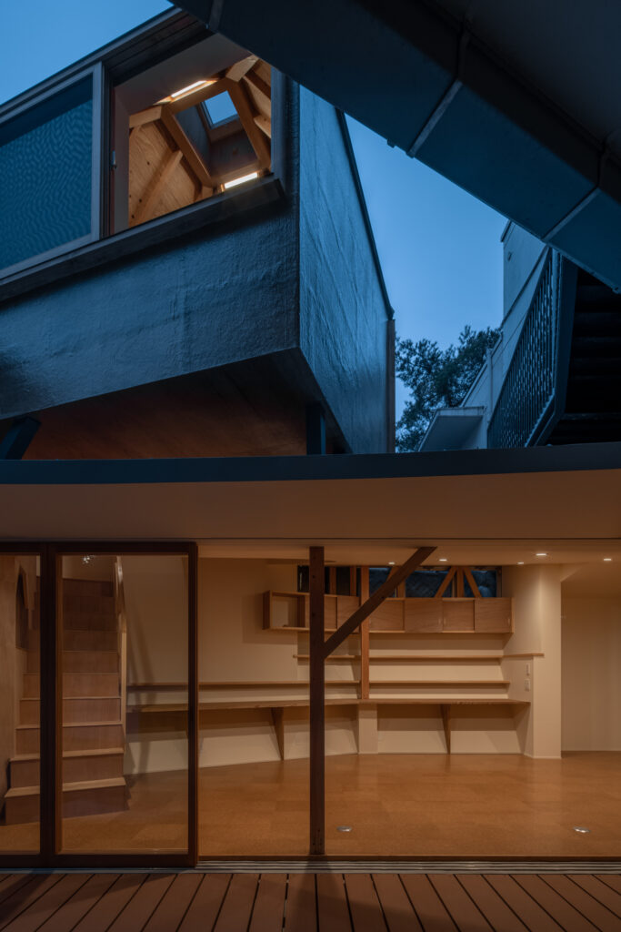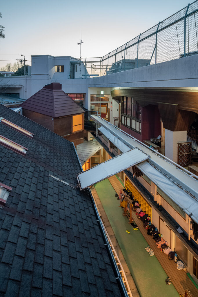 既存保育園の園舎と建物2層分の高さを持つ擁壁に囲まれた中庭を内部空間化するような増築計画。中庭をC字型に囲う擁壁に沿った耐力壁を設け,既存建物に対面する側の立面は開かれた立面となっており,内部は無柱の1室空間である。内部空間を極力大きく確保するため,外周の耐力壁は,斜めに立ち上がる擁壁に沿うようにやはり傾いた壁となっている。屋根の上には独立した小屋のような姿をした2階が突き出ており,1階の外周に沿って配置した柱によって支持されている。