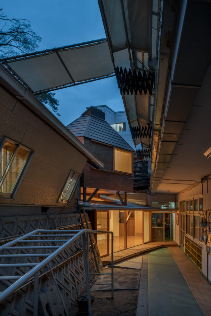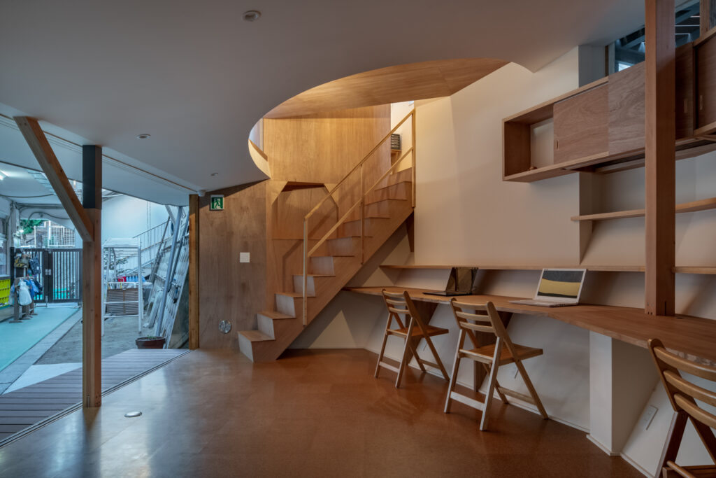 An extension that converts the courtyard—enclosed by the existing nursery building and a retaining wall as tall as two stories—into interior space. Shear walls are placed along the C-shaped retaining wall, while the elevation facing the existing building is kept open, creating a column-free, single-room interior. To maximize the interior area, the perimeter shear walls are inclined to follow the battered (sloping) retaining wall.